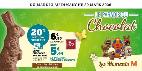 Du 3 au 29 mars 2026, vos magasins U de Thoiry, Etrembières et Neydens vous invitent à célébrer la douceur et la gourmandise de Pâques avec le catalogue chacolats "Les Moments M" : une collection pleine de fantaisie, de couleurs et de délices prêts à faire fondre petits et grands.